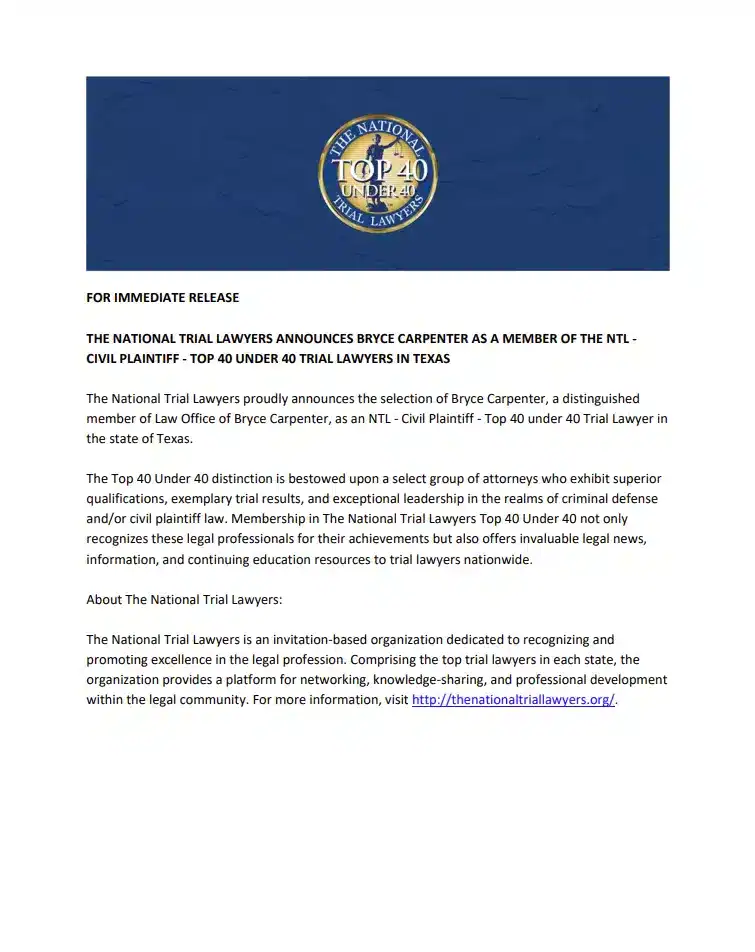Bryce Carpenter Named Top 40 Under 40 Trial Lawyer in Texas